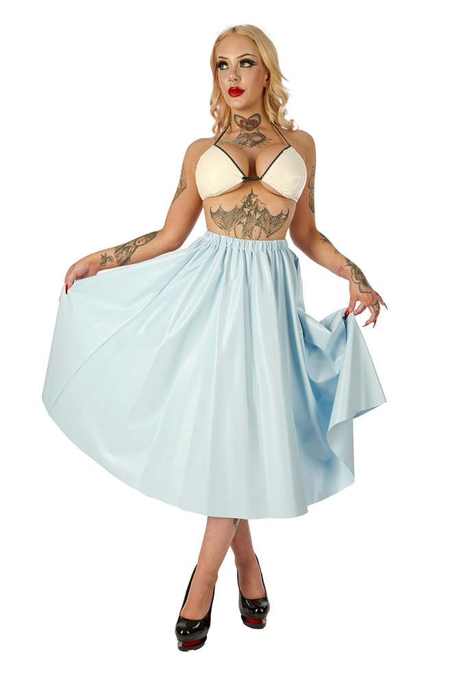 Einfach fließender PVC-Rock in voller Länge mit elastischem Bund. Das Material hängt und rafft sich und sieht so sexy aus, dass es alles darunter bedeckt. Länge von 71 - 86 cm je nach Größe.