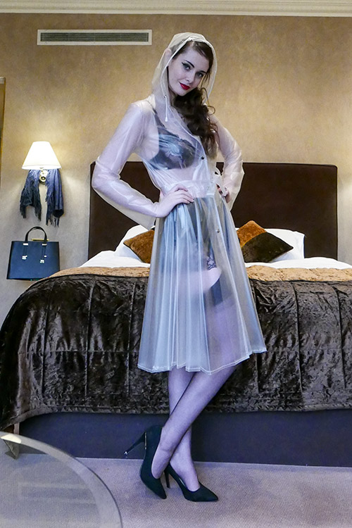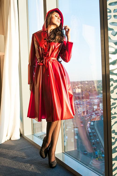 Jetzt NEU in PU noch mehr Style und noch exclusiver im Look! Halbtransparenter Regenmantel mit Kapuze im "romantic look" der 40er Jahre, oben eng geschnitten unten weich fliesend mit Druckknopfverschluß und Bindegürtel in Mantelfarbe.