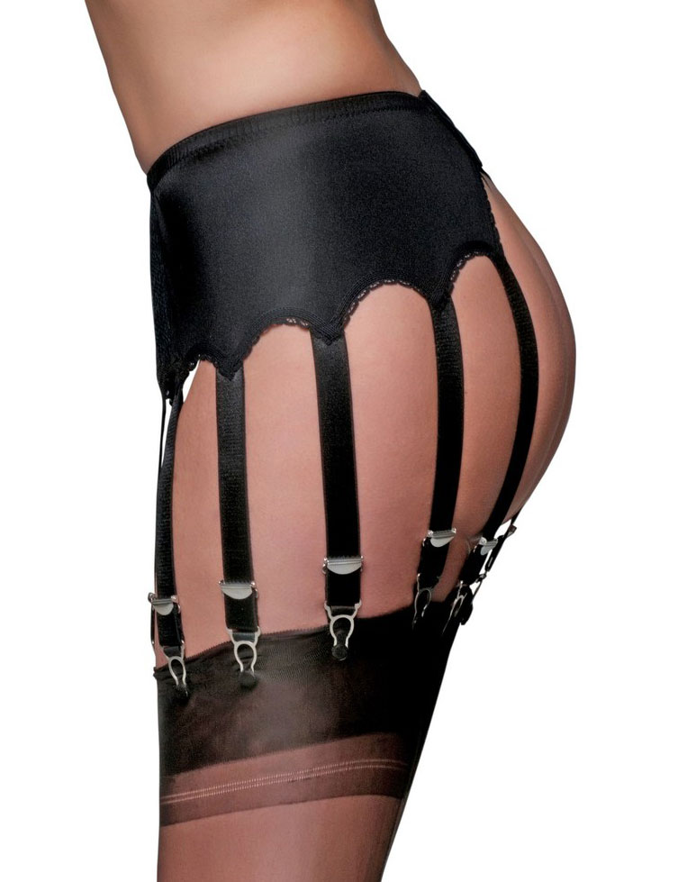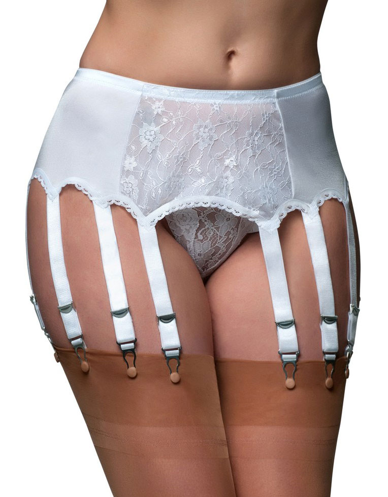 Strapsgürtel mit Spitzeneinsatz vorne und 12 Strumpfhalter mit Clips aus Metall zum einhängen von Nylon-Strümpfen, verstellbarer Hakenverschluß hinten. In den Farben Weiß, Schwarz oder Rot/Schwarz.